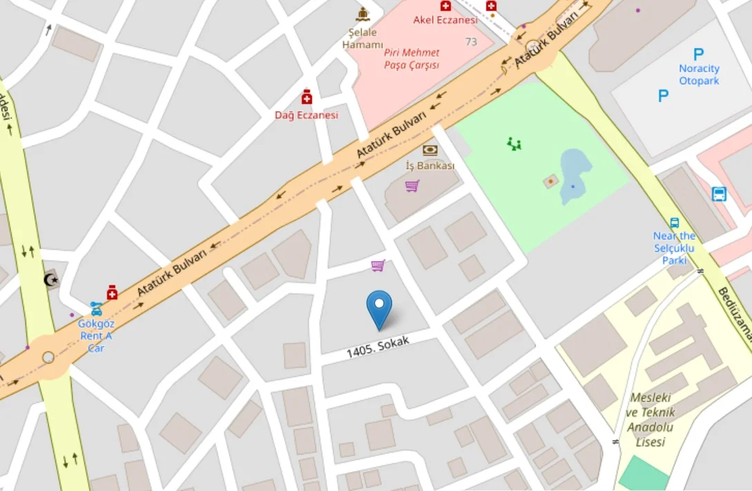 Çarşı merkezine ve ana yollara yakın, günlük insan ve araç sirkülasyonunun yoğun olduğu noktada konumlanmıştır.
